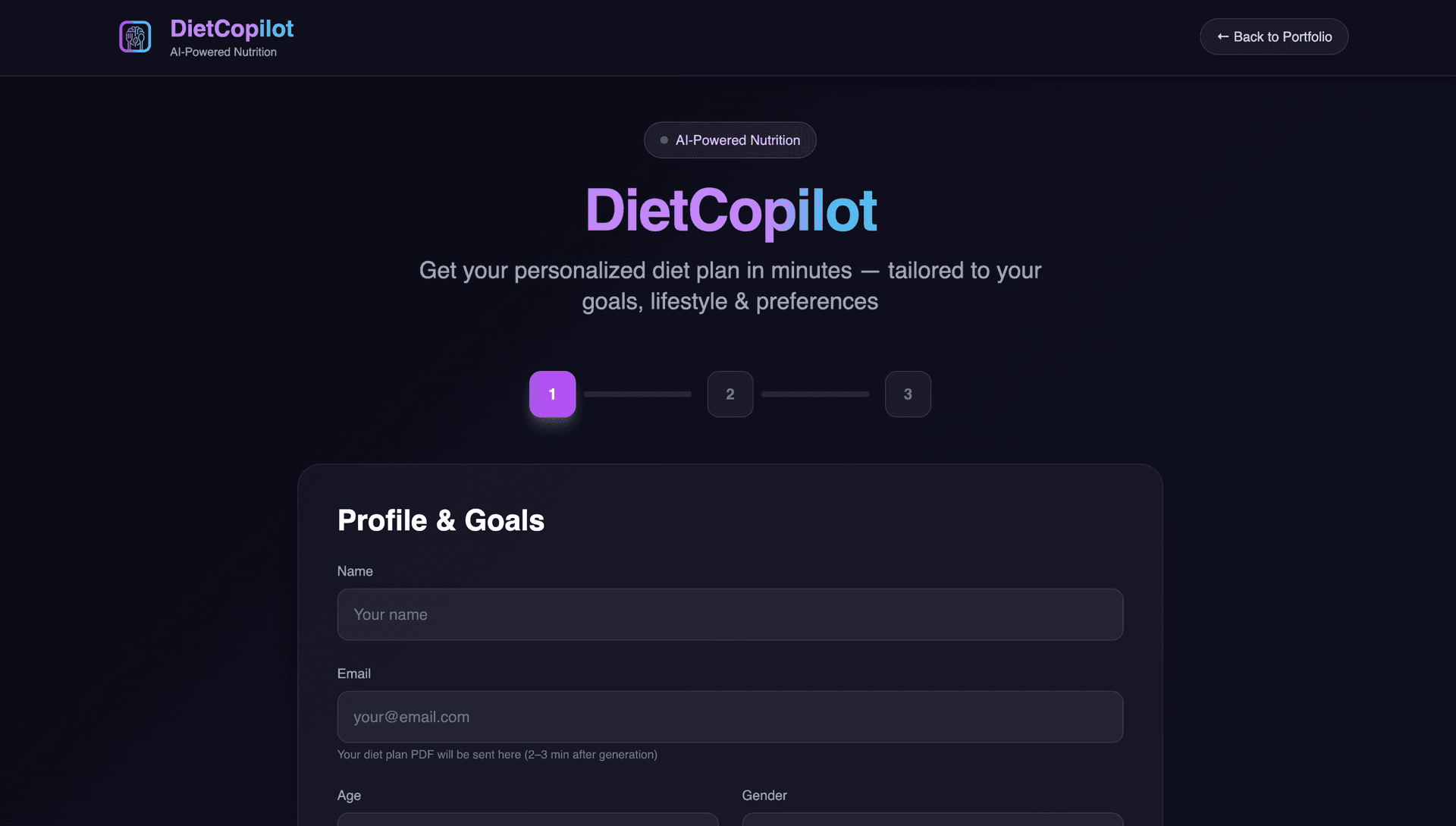AI-powered diet planner that delivers personalized daily meal plans in seconds. My full-stack + AI setup (LangGraph agent, TF-IDF retrieval, Gemini, TDEE/macros) turns a short form into a structured plan with multiple options per meal — plus PDF and email via ReportLab and Resend. Expertise meets AI for super fast, production-ready results. Next.js, FastAPI, Vercel, Render.